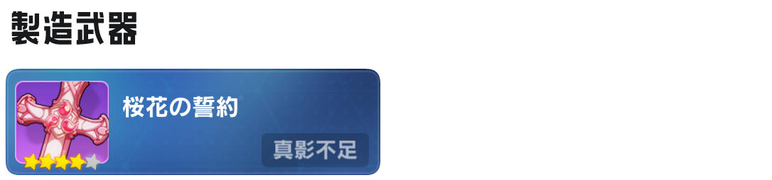 桜花輪舞曲は燃焼付与が強く、昔のキャラながら今でも記憶戦場(ボス戦のタイムアタック)で使われているサポーター(ただし敵は選ぶ)桜花の誓約は神の鍵にすることもできるので、製造武器だと最優先でもいいかも!