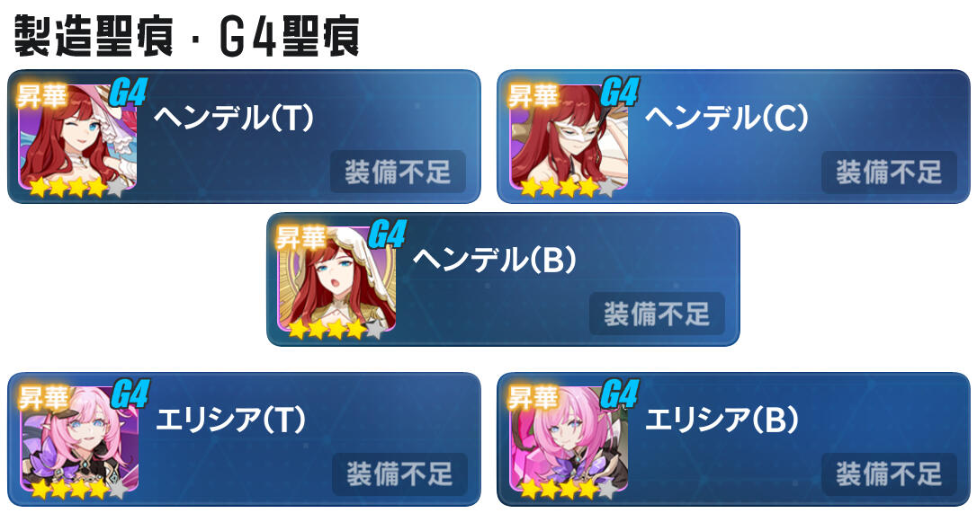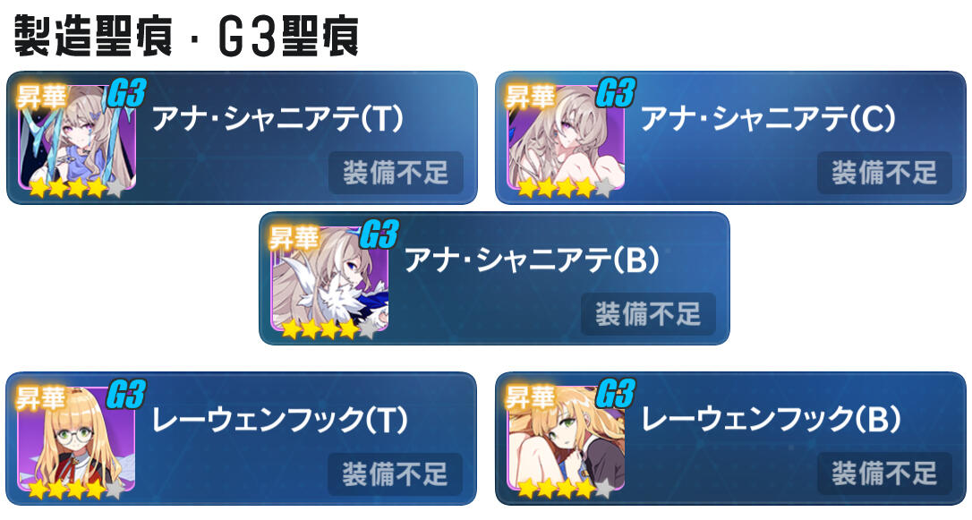 製造コストが高い=強いではないし、キャラの特性的に合う・合わないがあるので、戦乙女画面の本のマークから推奨装備を確認しよう装備ガチャを引くならアタッカーの武器が出るまで引いて、武器だけでも出たら撤退して製造聖痕で穴埋めというやり方が無・微課金にはおすすめ