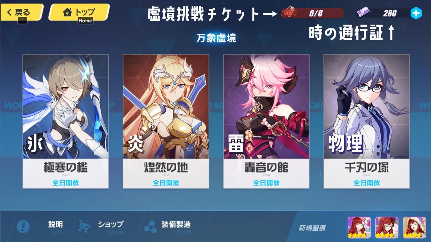 対応しているタイプはダメージがかなりUPして、それ以外はがっつりダメージがDOWNするのでアタッカーのタイプは合わせるようにしよう挑戦できる回数=虚境挑戦チケットで、このチケットは毎日配られる